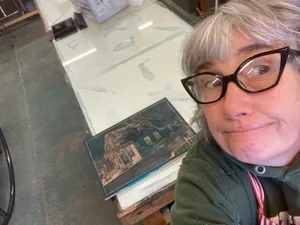 A different subject matter for me this time. It’s based on a photograph taken of Laura Coombs Hills. I used a soft ground etching to draw her and then a carborundum plate to give the tone of the dress. In this print,I collaged the dress from another print on top. The whole print is then glued to a wooden panel for the Newburyport Art Association - 7X5 show.